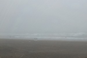 今朝は雨降りで霧がかかって波が見えません。