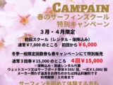 🌸春のサーフィンスクール特別キャンペーン🌸 暖かく春めいてきましたね😊 海も日中の太陽のお陰でサーフィンが楽しめるコンディションとなってきました🌞 そこで❗ サーフィンス...